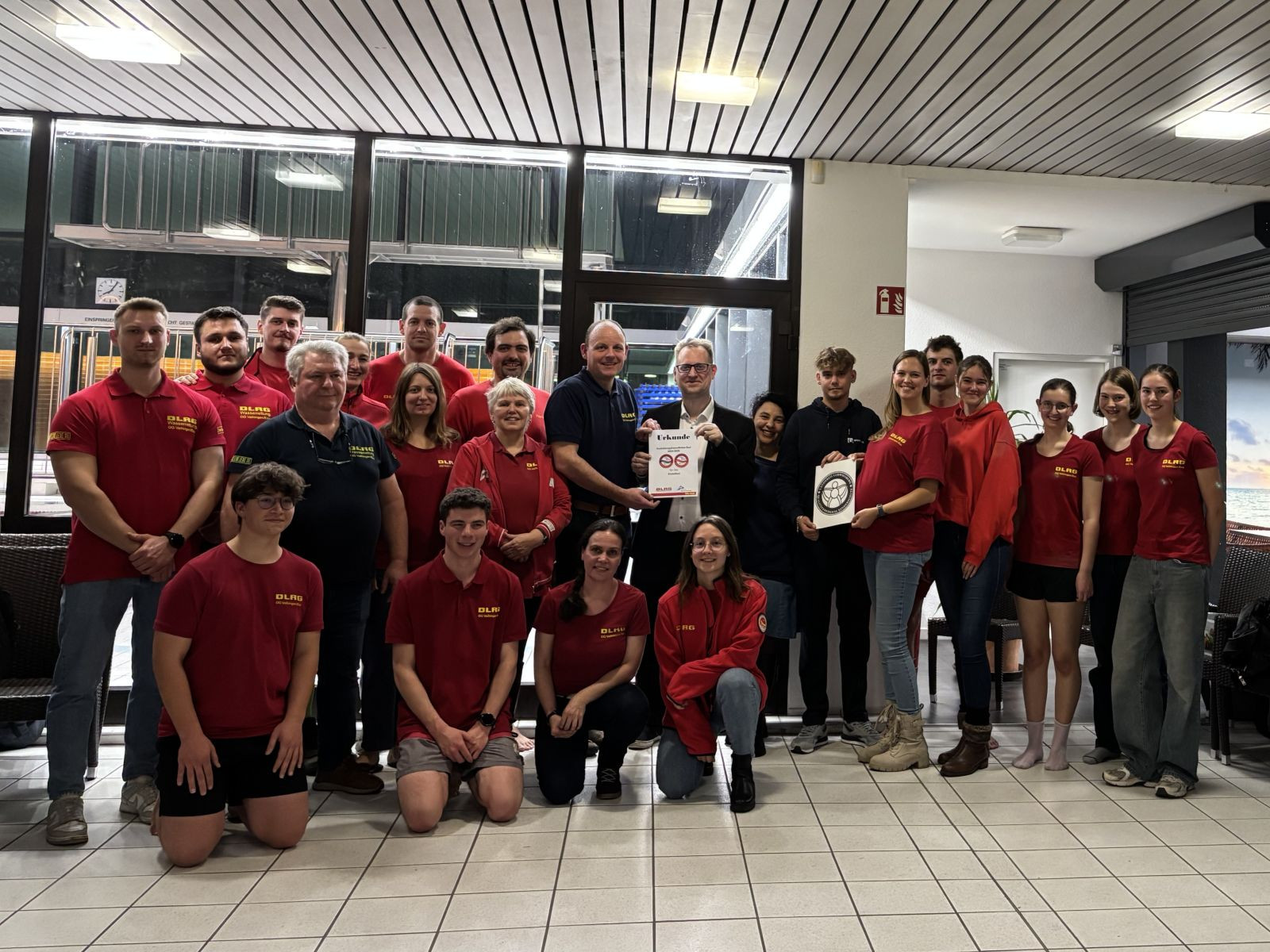 Jeden Montagabend findet im Vaihinger Enztalbad das Jugendtraining der DLRG Ortsgruppe Vaihingen mit durchschnittlich 100 Kindern und Jugendlichen statt. Doch an diesem Montag herrschte in dem Schwimmbad ein noch größerer Andrang als gewohnt. Kurz vor Ende des Kindertrainings füllte sich das Foyer mit zahlreichen Gästen, darunter Alexander Kern, Kämmerer der Stadt Vaihingen, und seine Kollegin Hakiye Knittel sowie Badleiter Luan Gashi. Anlass war eine besondere Ehrung: Das Enztalbad wurde als „Ausbildungsfreundliches Bad" in den Kategorien „Anfängerschwimmen" und „Rettungsschwimmen" ausgezeichnet.